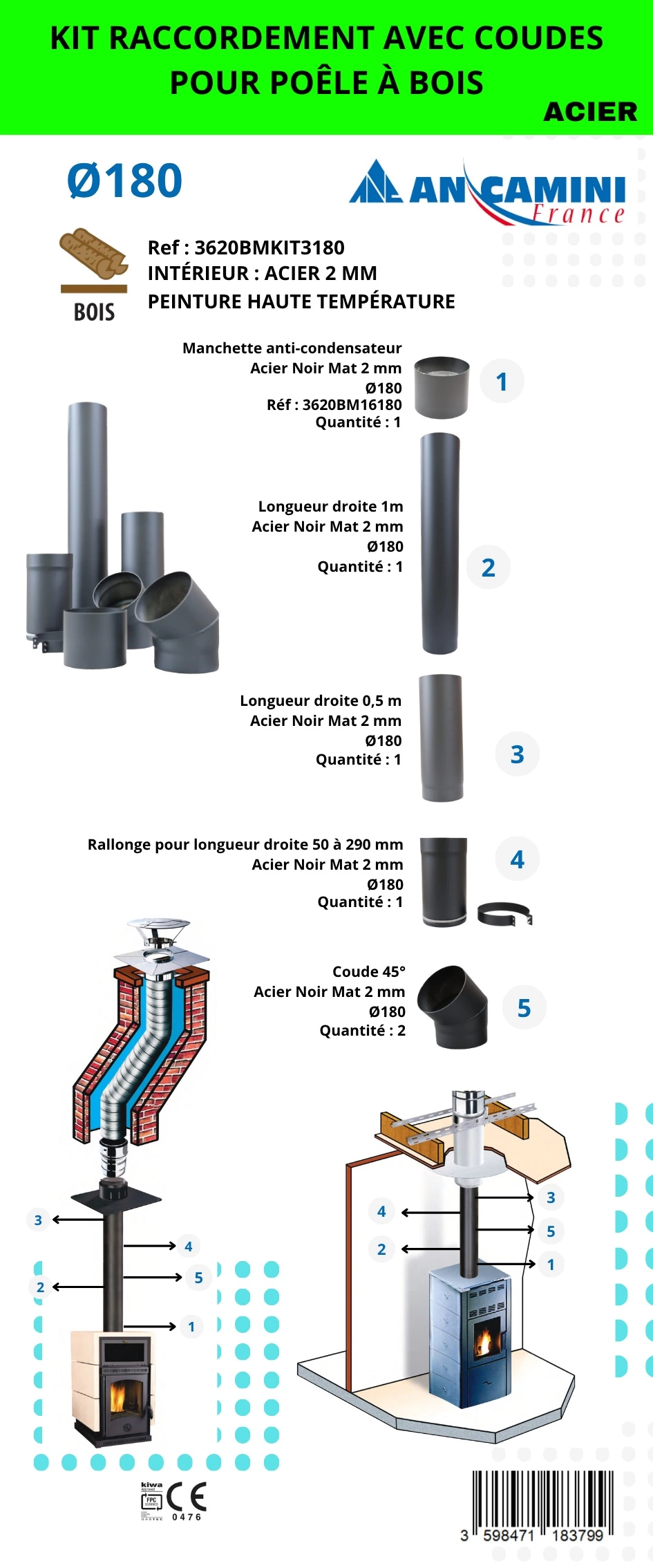 OFFERTCe kit de raccordement Ø180 avec coudes en acier noir mat 2 mm est conçu pour installer facilement un poêle à bois lorsque l’évacuation nécessite un dévoiement. Il offre une solution robuste, esthétique et parfaitement adaptée aux exigences des installations haute température.